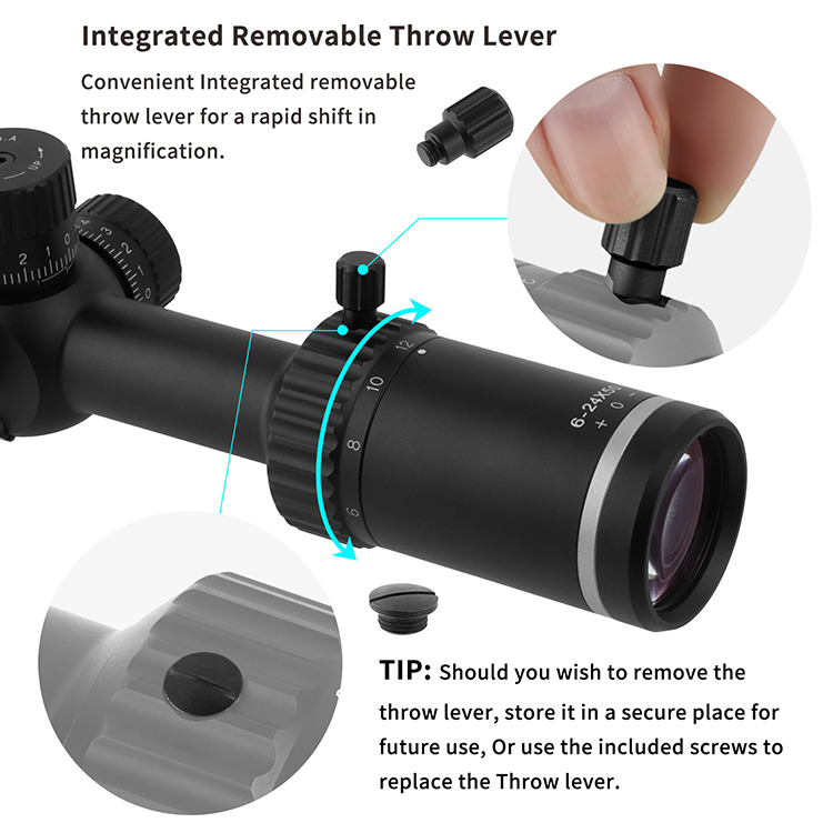 Convenient Integrated removable throw lever for a rapid shift in magnification.(2 throw levers are all removable,so there is a cap to fit into that).