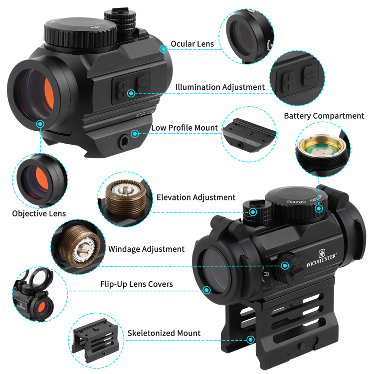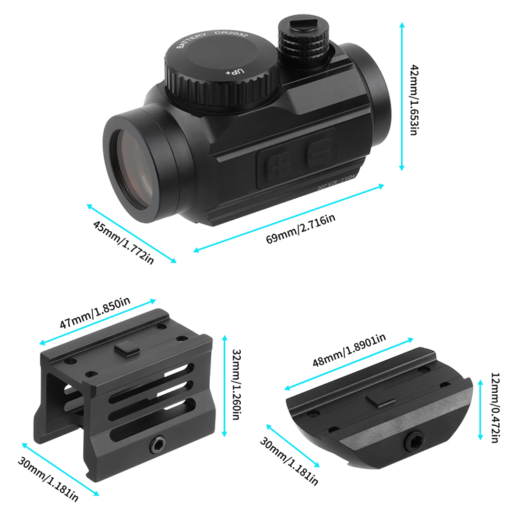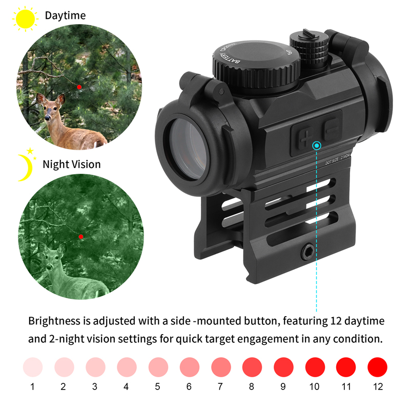 The sight is a sealed compact red dot or green dot sight intended for carbine, shotgun, and air rifle. Brightness is adjusted with a side -mounted button, featuring 12 daytime and 2-night vision settings for quick target engagement in any condition.