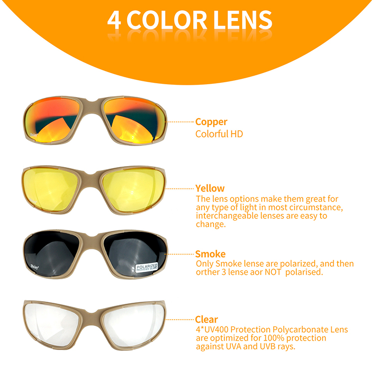 4 Color Lens - Copper,Yellow & Smoke and Clear, the lens options make them great for any type of light in most circumstance, interchangeable lenses are easy to change.