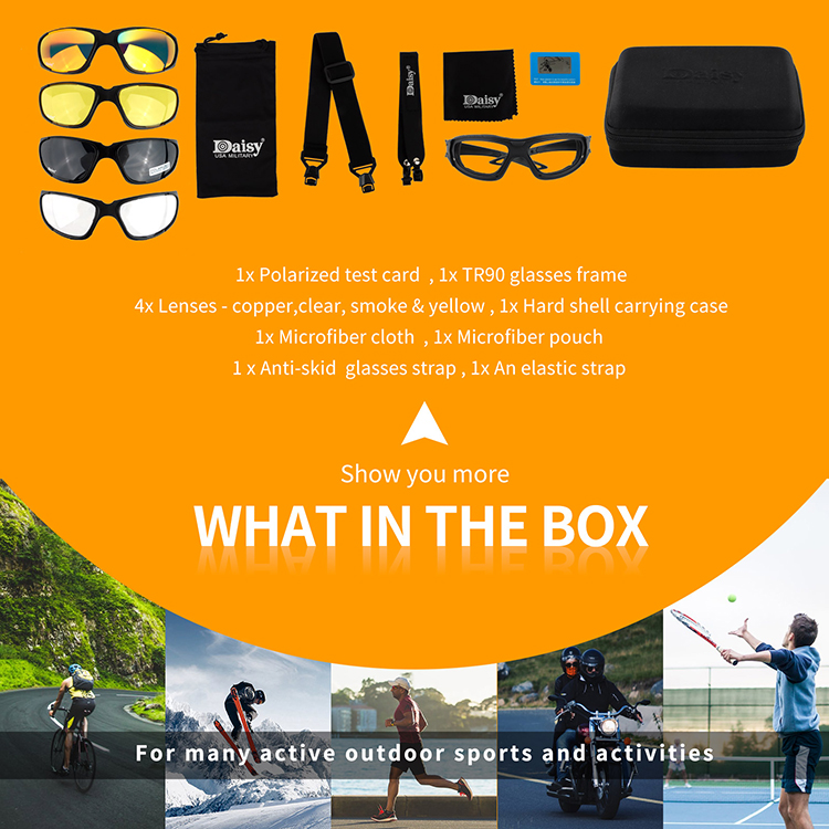 4 Color Lens - Copper,Yellow & Smoke and Clear, the lens options make them great for any type of light in most circumstance, interchangeable lenses are easy to change.