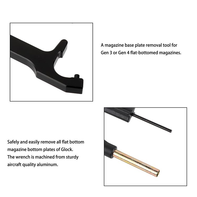 Safely and easily remove all flat bottom magazine bottom plates of Glock