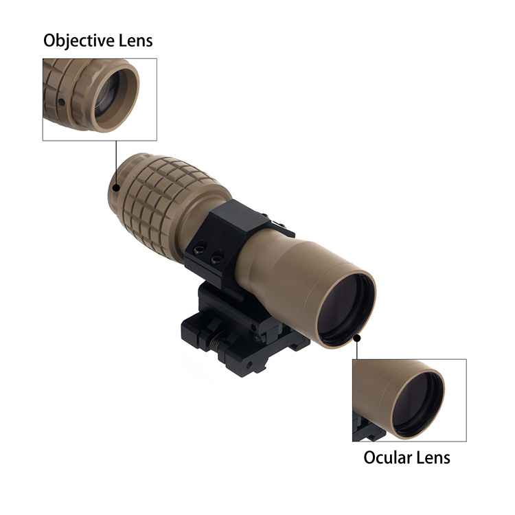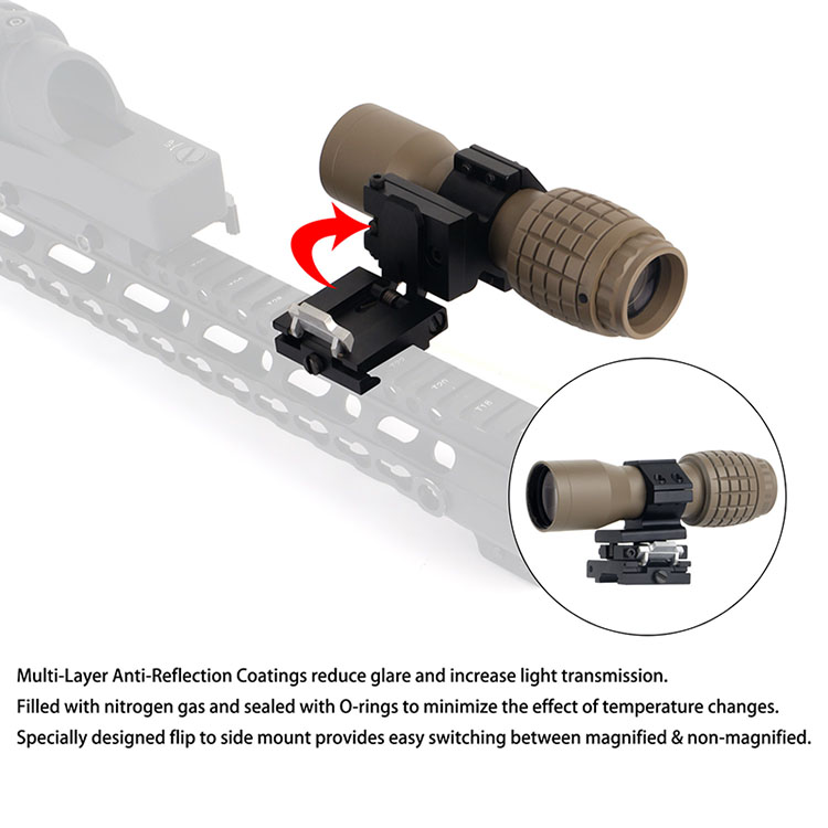 4X Magnifier with 30mm FTS flip to side mount is designed for compatibility with most red dot sights and for maximum flexibility & increased performance. The shockproof optic is built to withstand the recoil of any weapon, including shotguns and large-caliber rifles. 4X Magnifier features an adjustable focus knob, you can turn the focus dial clockwise or counter-clockwise until the image is as sharp as possible. when combined with the FTS flip to side mount, the 4x Magnifier gives you the ability to switch in a split second from to switch from Close Quarters Battle to semi-sniping and back. The 4X Magnifier with 30mm FTS flip to side mount also can be used as a handheld magnifying glass monocular for discrete observation and identification.
