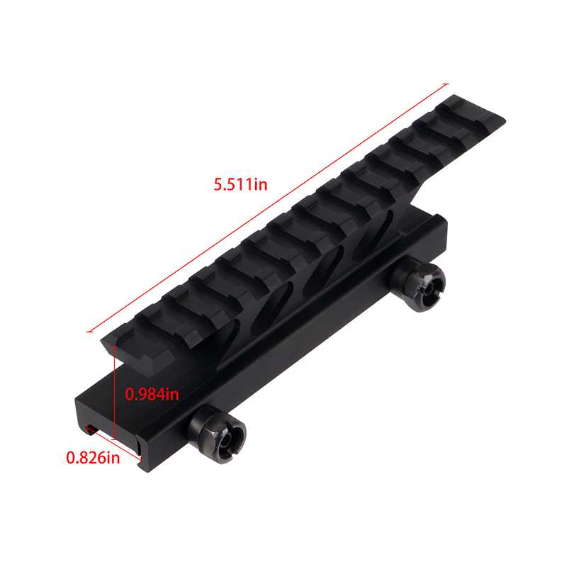 The riser is 5.50 inches in length with 13 Picatinny rail slots. It accepts all Picatinny or Weaver based scopes, red dots, or optics.