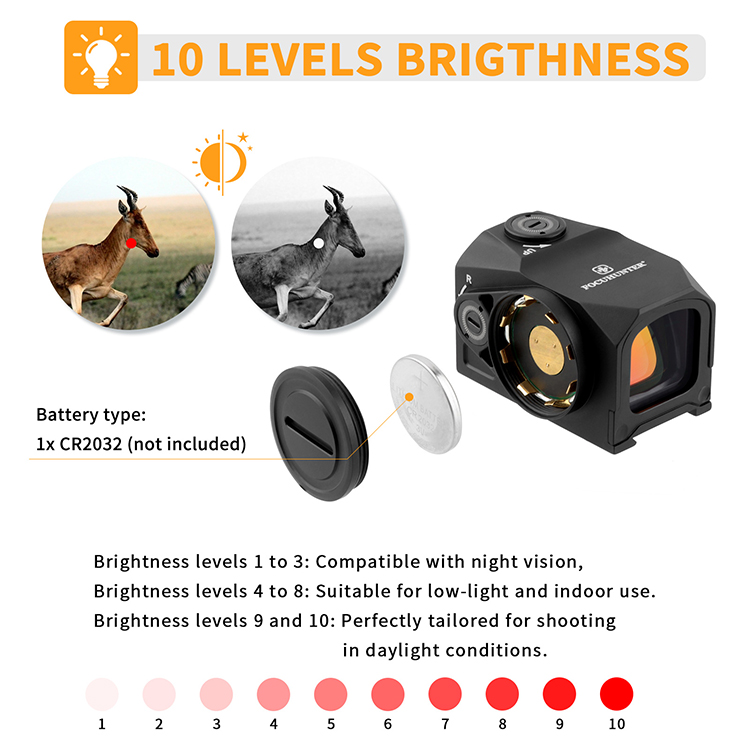 The FOCUHUNTER 1X19mm red dot sight features a distinct 3 MOA dot available in red, complemented by 10 adjustable brightness levels. This red \sight is designed for extended use, thanks to its side-mounted CR2032 battery and the automatic Shake F' Wake on/off function. Its brightness levels 1 and 2 are compatible with night vision, while levels 3 to 8 are suitable for low-light and indoor use. The highest settings, 9 and 10, are perfectly tailored for shooting in daylight conditions.