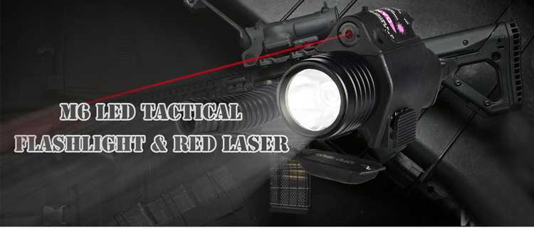 The M6 Tactical Flashlight features a visible red aiming laser, a spring-loaded QD mount, and an extension remote switch.
