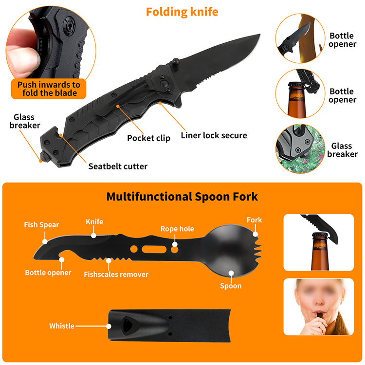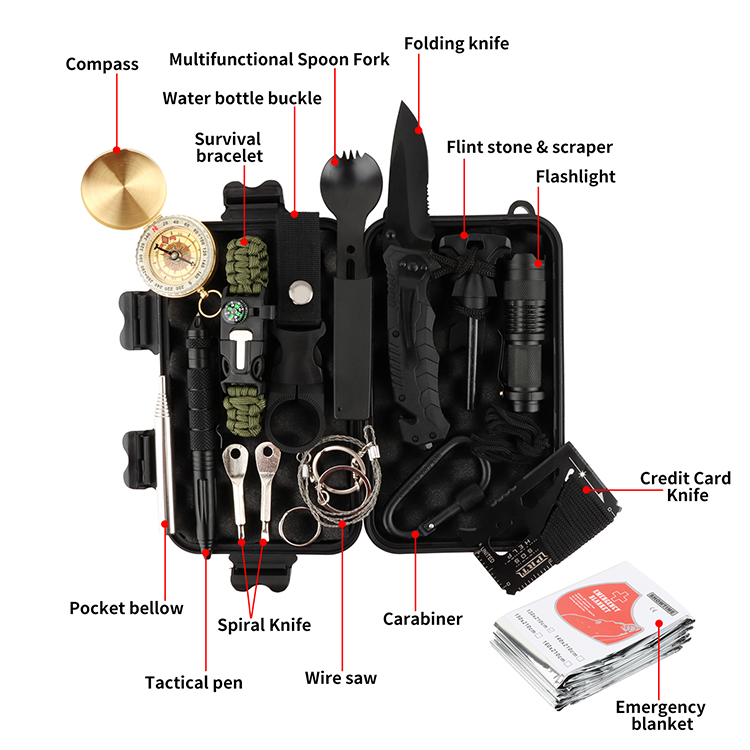 17 in 1 Survival Gear and Equipment- Our emergency kit contains the most popular camping accessories: Folding Knife,Pen, Compass, Flashlight, Pocket Bellow, Bottle Hanging Buckle, Multi-use Spork, Survival Bracelet, Fire Starter, Fire Starting Stick, Multifunctional Card, Wire Saw, Emergency Blanket, Keychain Screwdrivers,SOS whistle, Carabiner Clip Key, Cord.