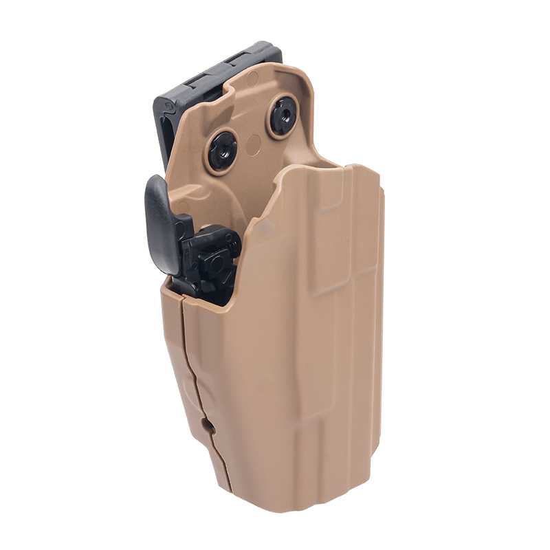 The lock release button is located at the back of the holster, which allows for comfortable and quick operation with the middle finger as well as minimizes the risk of accidental triggering.